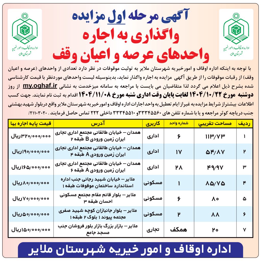 با توجه به اینکه اداره اوقاف و امورخیریه شهرستان ملایر به تولیت موقوفات در نظر دارد تعدادی از واحدهای (عرصه و اعیان وقف) از رقبات موقوفات را از طریق آگهی مزایده به اجاره واگذار نماید، بدینوسیله لیست واحدهای موردنظر با قیمت کارشناسی شده بشرح ذیل اعلام می گردد لذا متقاضیان می بایست با مراجعه به سامانه میزخدمت به نشانی my.oghaf.ir از روز دوشنبه مورخ ۲۲/۱۰/۱۴۰۴ لغایت پایان وقت اداری شنبه مورخ ۰۸/۱۱/۱۴۰۴ اقدام به ثبت نام نمایند. جهت کسب اطلاعات بیشتراز شرایط مزایده به غیراز ایام تعطیل به واحد اجارات اداره اوقاف و امورخیریه شهرستان ملایر واقع دربلوار شهید بهشتی جنب دریاچه کوثر مراجعه و یا با شماره تلفن های ۳۳۳۴۵۵۶۰و ۳۳۳۴۵۵۱۰ داخلی ۲۲۲ تماس حاصل فرمایند . ۲۱۱۰۳۰۲۰/
