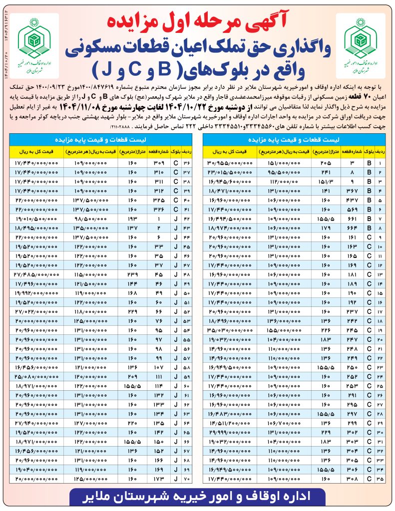 با توجه به اینکه اداره اوقاف و امورخیریه شهرستان ملایر در نظر دارد برابر مجوز سازمان محترم متبوع بشماره ۸۴۷۶۱۹/۱۴۰۰مورخ ۲۳/۰۹/۱۴۰۰ حق تملک اعیان ۷۰ قطعه زمین مسکونی از رقبات موقوفه میرزامحمدعضدی قاجار واقع در ملایر شهرک ولیعصر(عج) بلوک های B و C و J را از طریق مزایده با قیمت پایه مزایده به شرح ذیل واگذار نماید لذا متقاضیان می توانند از دوشنبه مورخ ۲۲/۱۰/۱۴۰۴ لغایت چهارشنبه مورخ ۰۸/۱۱/۱۴۰۴ به غیر از ایام تعطیل جهت دریافت اوراق شرکت در مزایده به واحد اجارات اداره اوقاف و امورخیریه شهرستان ملایر واقع در ملایر- بلوار شهید بهشتی جنب دریاچه کوثر مراجعه و یا جهت کسب اطلاعات بیشتر با شماره تلفن های۳۳۳۴۵۵۶۰و۳۳۳۴۵۵۱۰ داخلی ۲۲۲ تماس حاصل فرمایند . ۲۱۱۰۲۸۸۸/