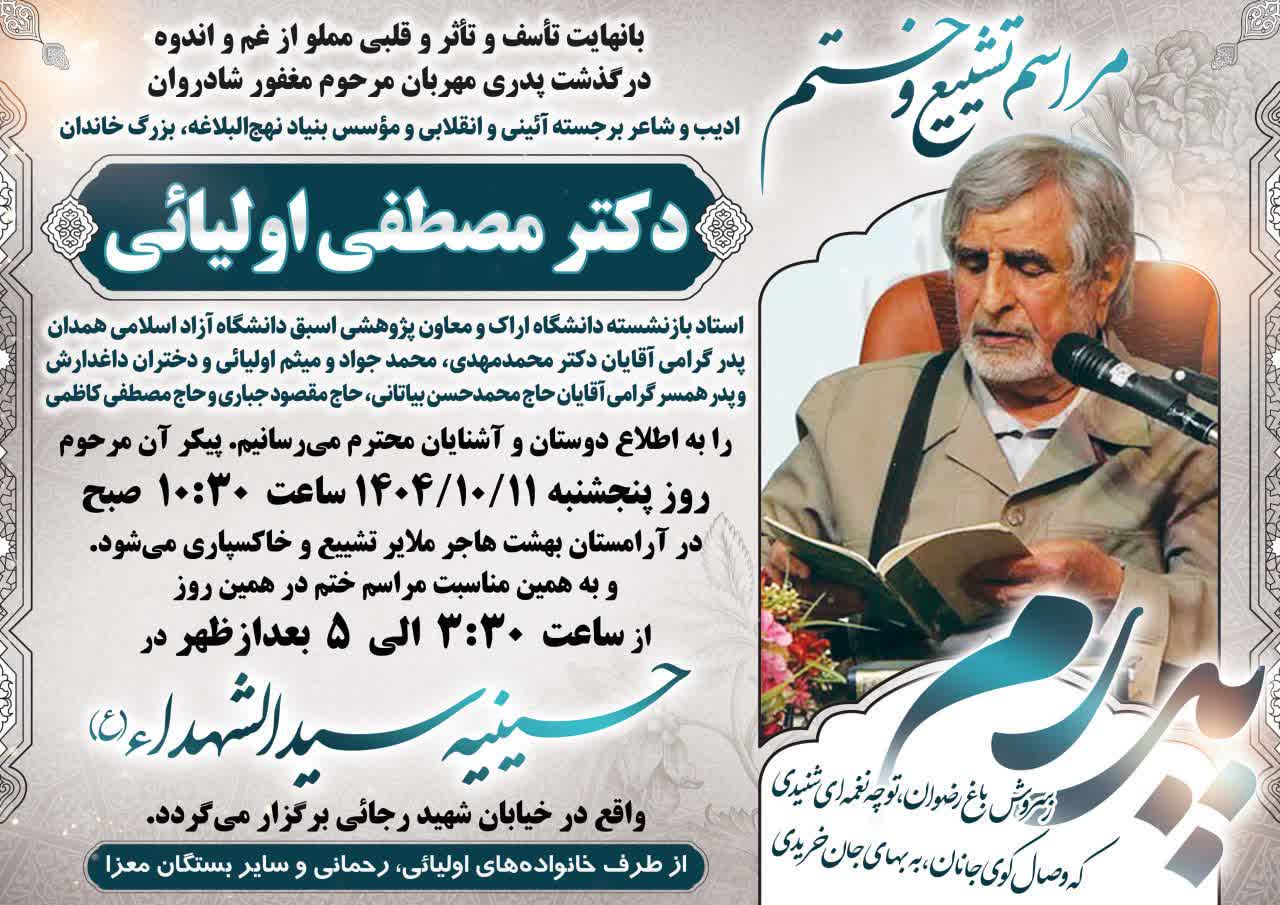 دکتر مصطفی اولیائی ادیب و شاعر برجسته آئینی ملایر، دار فانی را وداع گفت / +بیوگرافی