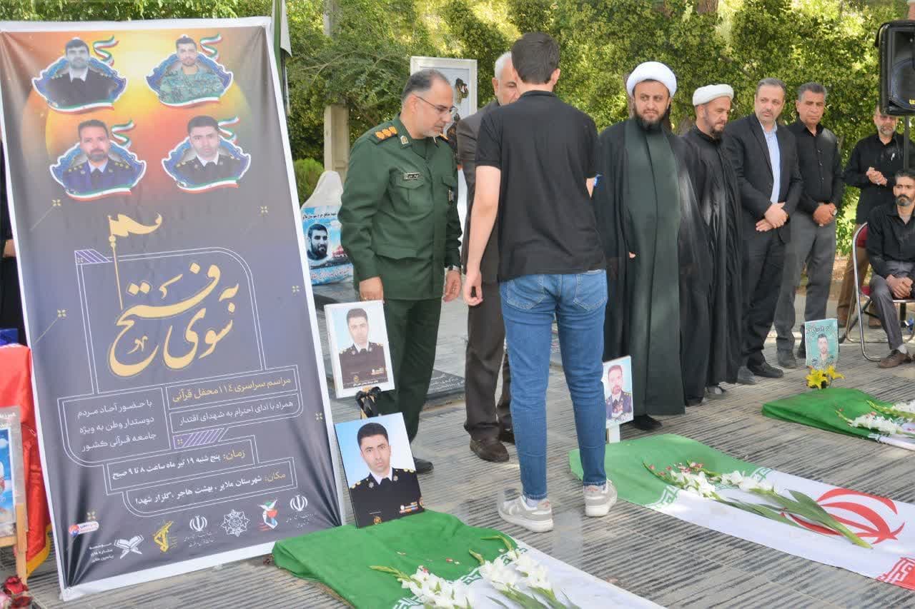 مراسم سراسری ۱۱۴ محفل قرآنی با عنوان “بهسوی فتح” و بهمنظور ادای احترام به شهدای معزز اقتدار، روز پنجشنبه ۱۹ تیرماه در گلزار شهدای آرامستان بهشت هاجر برگزار شد.