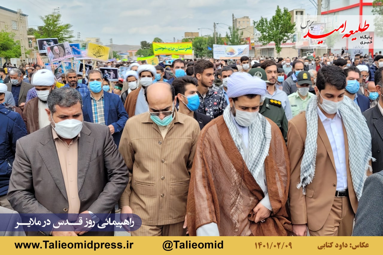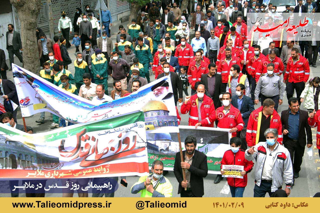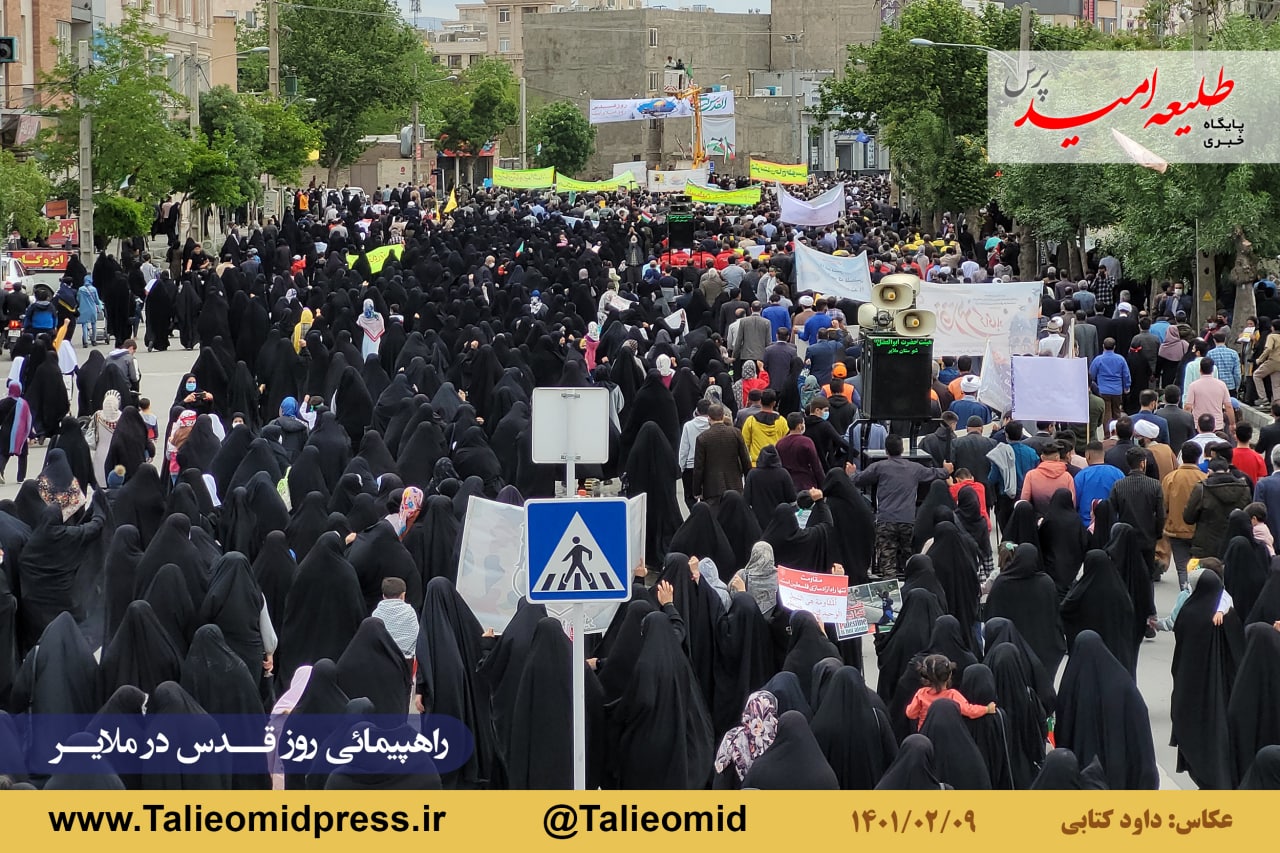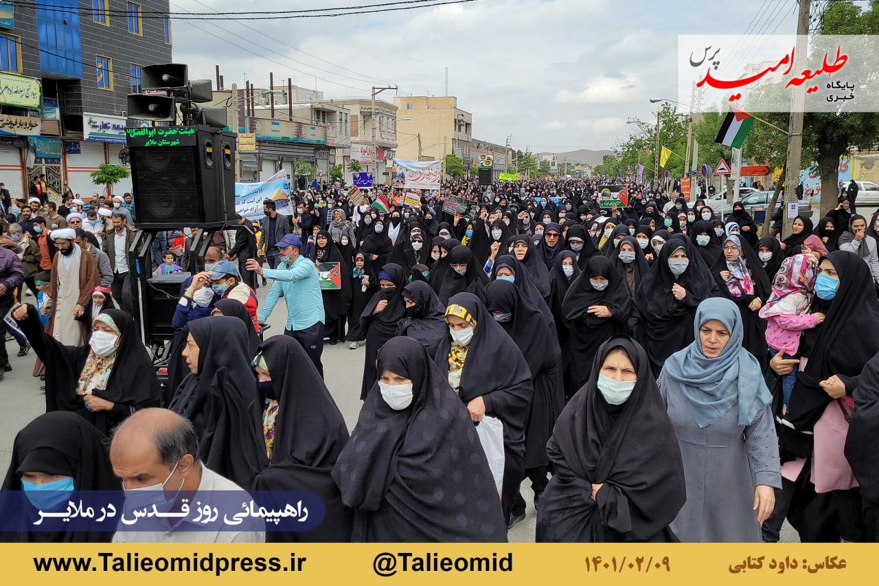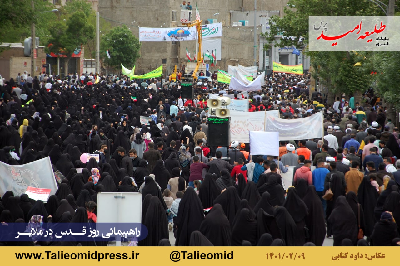 ملایر – پایگاه خبری طلیعه امید پرس: مردم روزه دار شهر ملایر با حضور پرشور در راهپیمایی یوم الله قدس، در حمایت از مردم مظلوم و مقتدر فلسطین برگ زرین دیگری در دفتر تاریخ پرافتخار این شهر را به ثبت رساندند.